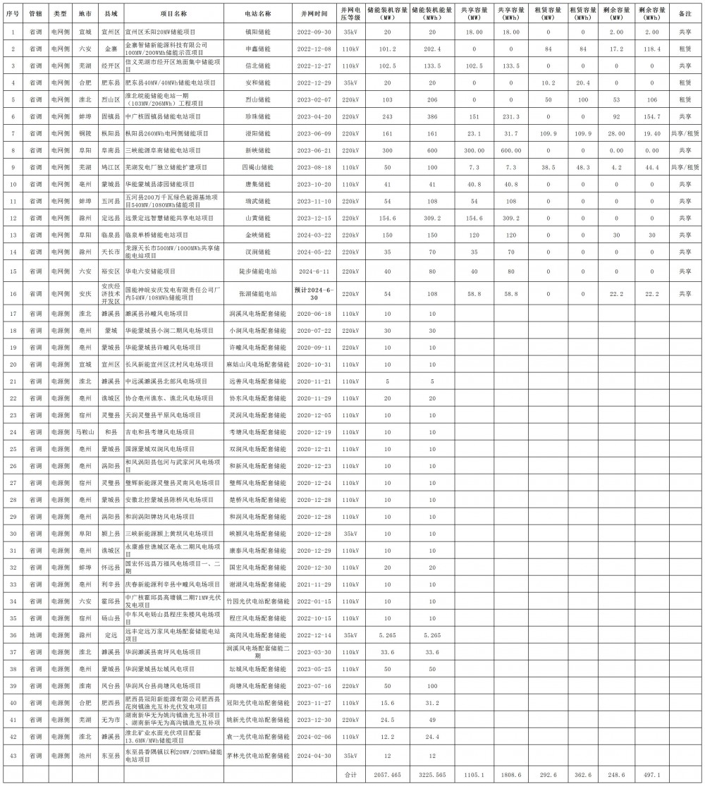 安徽省能源局关于2024年7月独立新型储能项目统筹调用的公示