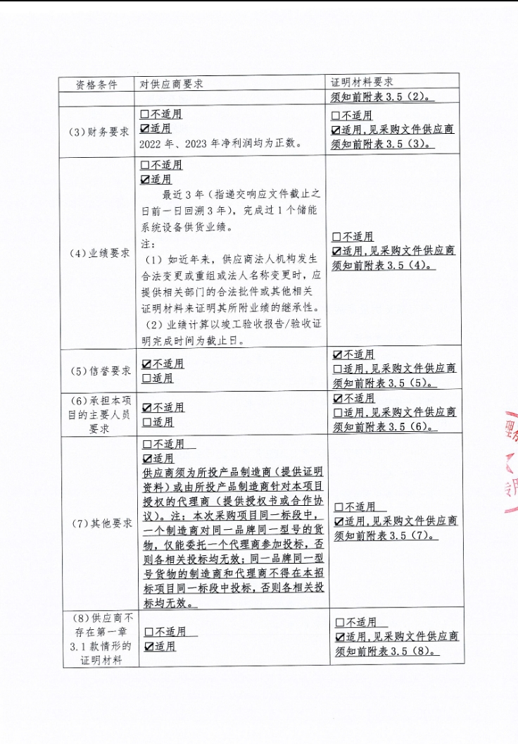 投标人要求最近3年(指递交响应文件截止之日前一日回溯3年),完成过1个储能系统设备供货业绩。