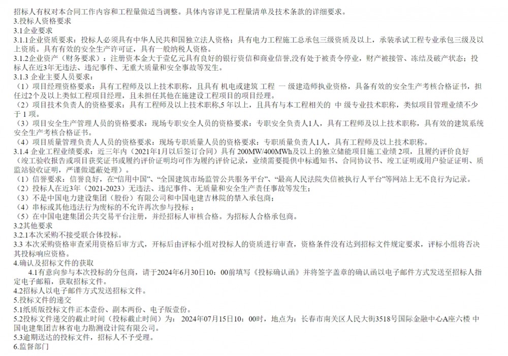 据电力家了解到,6月27日,中国电建吉林院吴忠市牛首山能源科技有限公司板桥200兆瓦400兆瓦时共享储能电站项目EPC总承包项目施工分包招标公告发布。