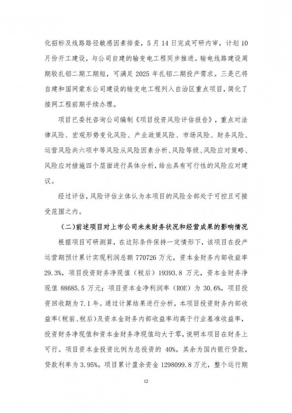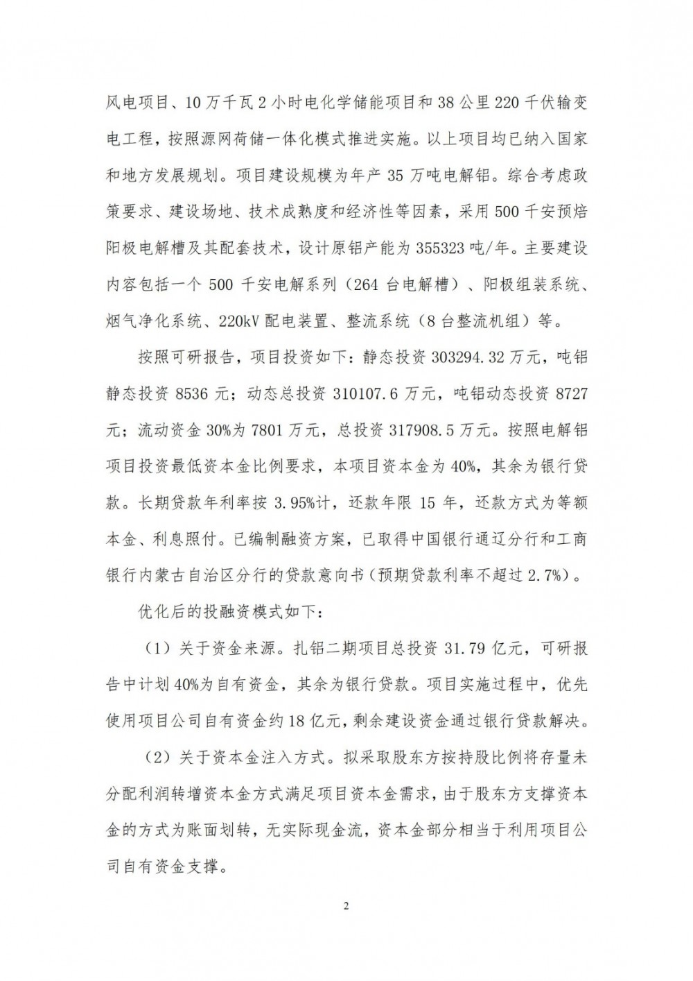 项目静态投资303294.32万元,吨铝静态投资8536元;动态总投资310107.6万元,吨铝动态投资8727元;流动资金30%为7801万元,总投资317908.5万元。按照电解铝项目投资最低资本金比例要求,本项目资本金为40%,其余为银行贷款。