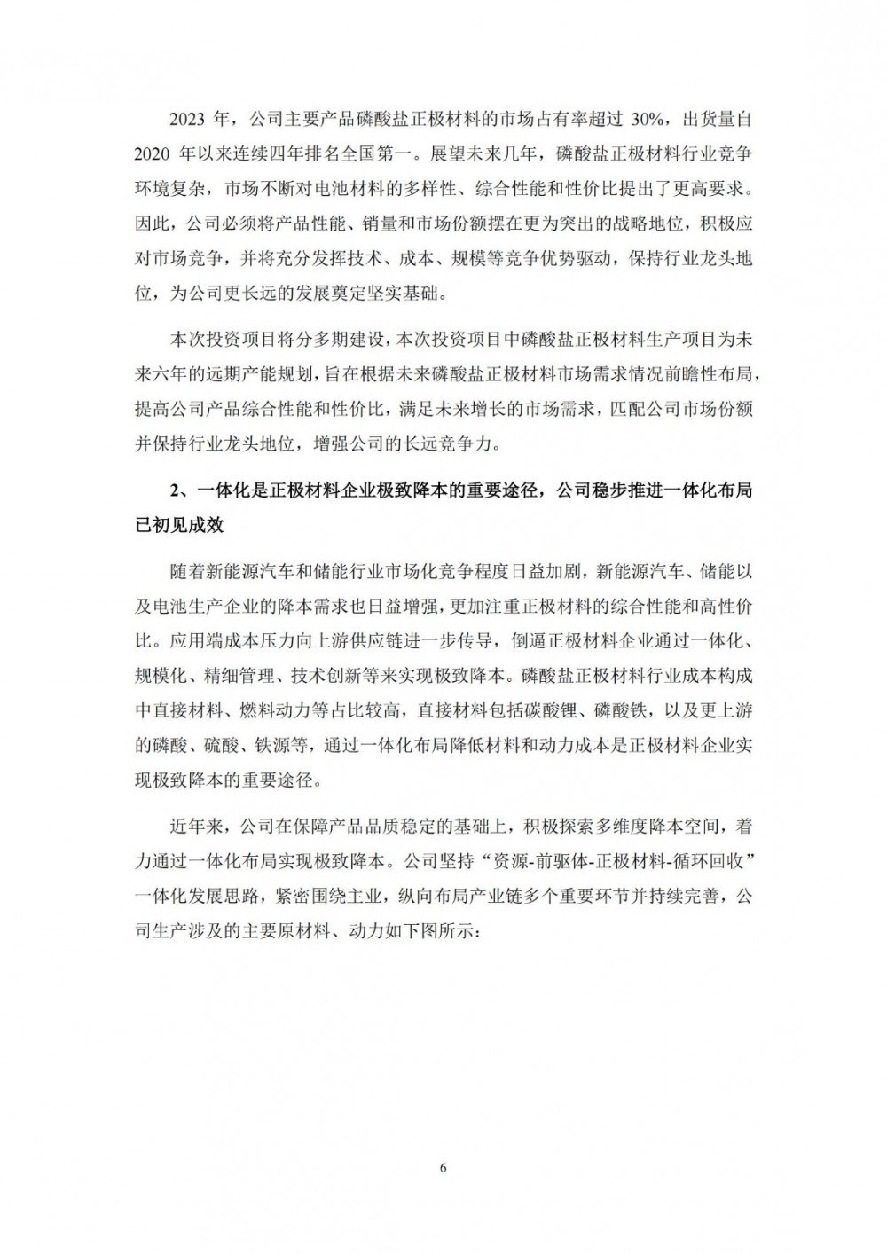 湖南裕能表示,本次投资项目将分多期建设,本次投资项目中磷酸盐正极材料生产项目为未来六年的远期产能规划,旨在根据未来磷酸盐正极材料市场需求情况前瞻性布局,提高公司产品综合性能和性价比,满足未来增长的市场需求,匹配公司市场份额并保持行业龙头地位,增强公司的长远竞争力。
