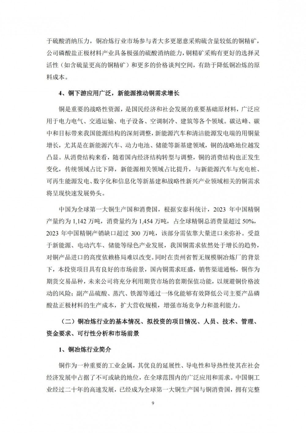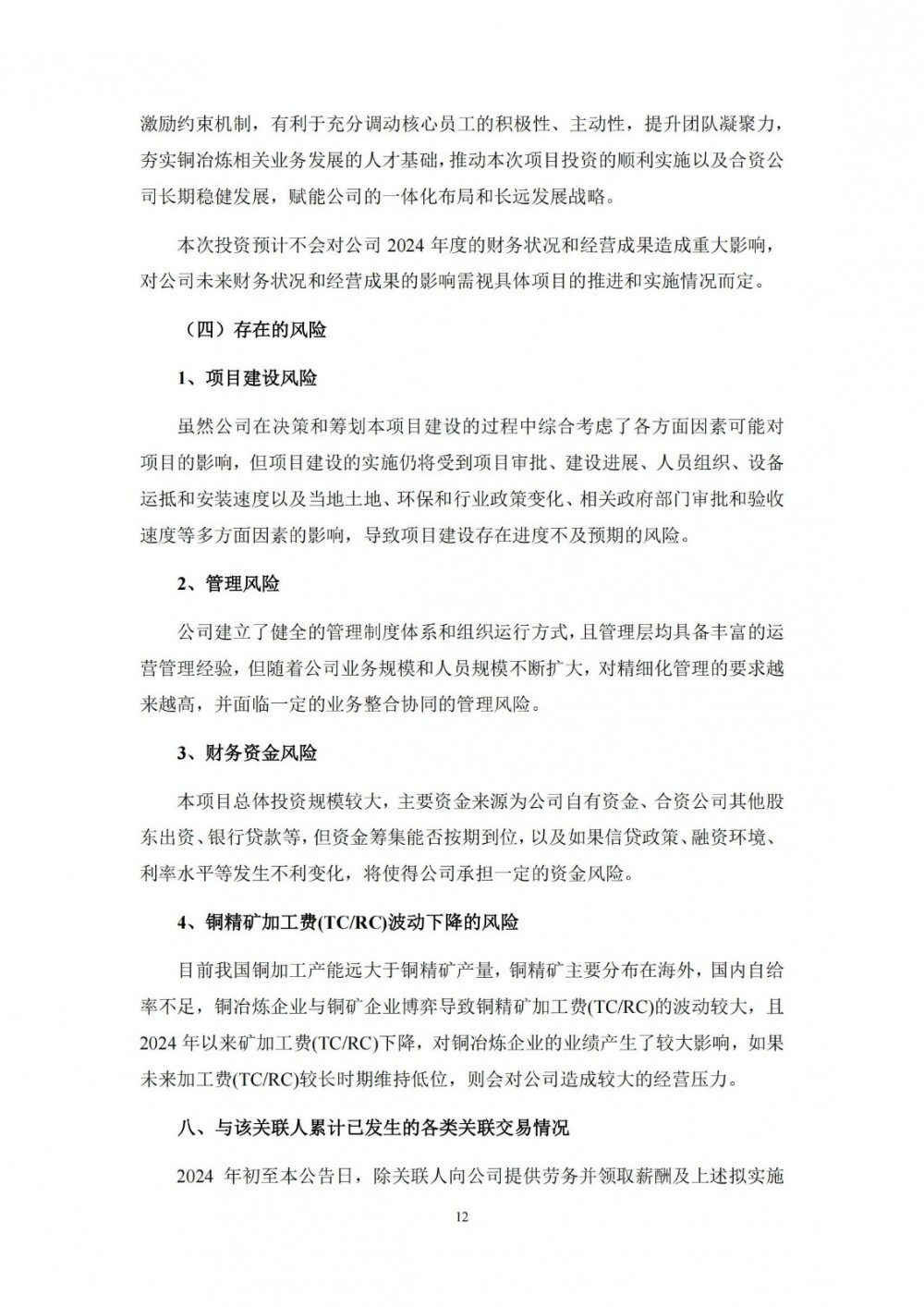 针对本次投资事项,公司拟与贵州省黔南布依族苗族自治州人民政府签署《战略合作协议》,并就项目具体事宜拟与贵州省福泉市人民政府签署《项目投资合同》。项目将分多期建设,其中一期投资35亿元,建设20万吨/年铜冶炼联产80万吨/年硫酸、80万吨/年蒸汽项目(硫酸和蒸汽为副产品)。