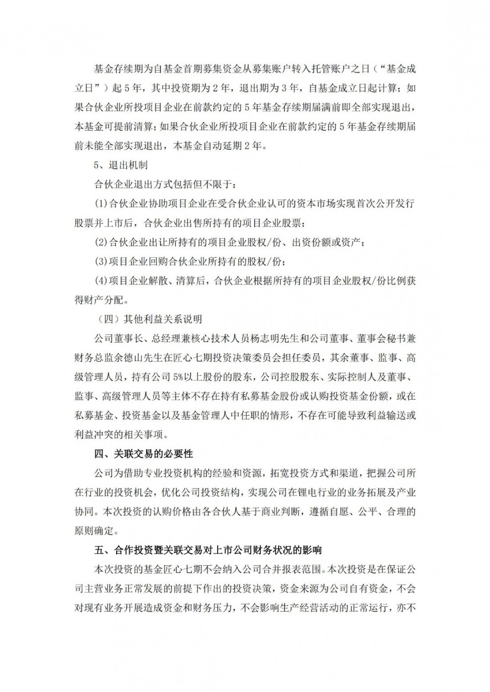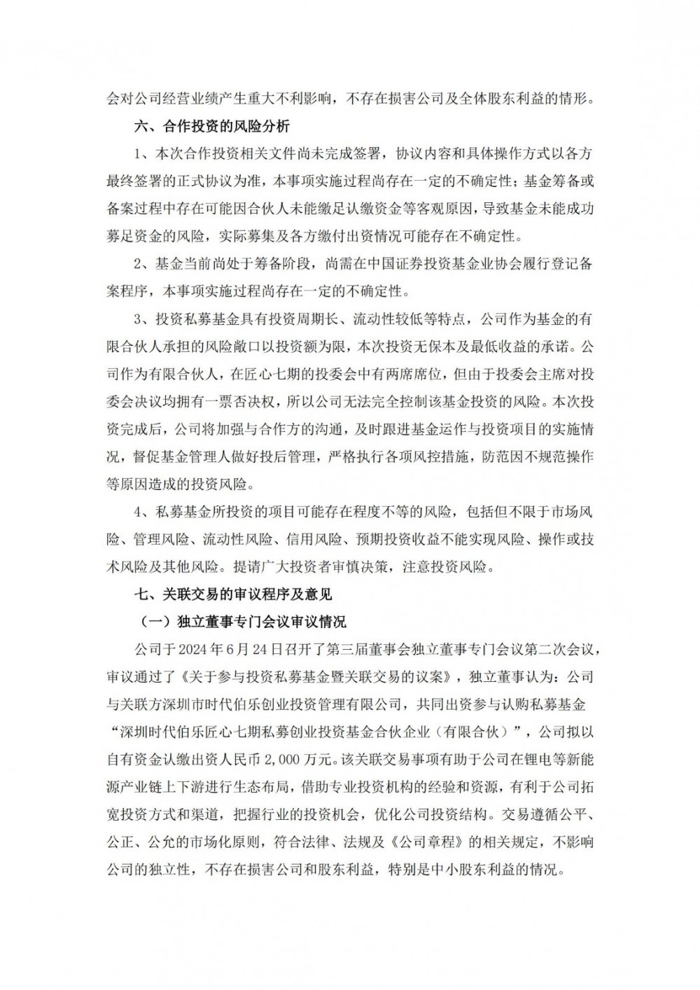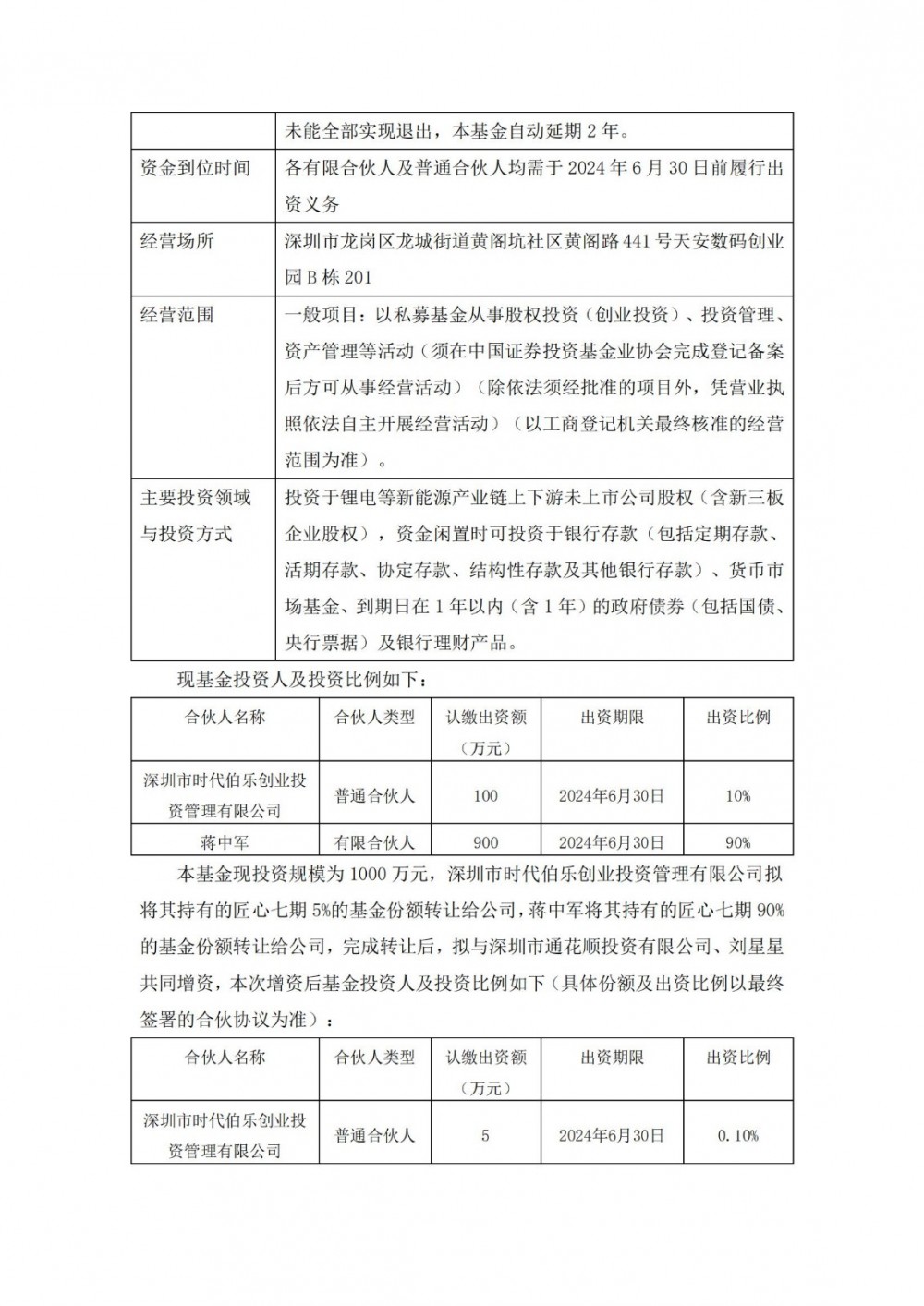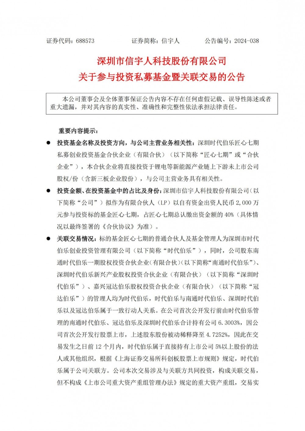 据电力家了解到,6月28日,信宇人发布公告称,为借助专业投资机构的经验和资源,拓宽投资方式和渠道,把握公司所在行业的投资机会,优化公司投资结构,公司本次拟作为有限合伙人与时代伯乐签署《深圳时代伯乐匠心七期私募创业投资基金合伙企业(有限合伙)合伙协议》,共同出资投资私募基金匠心七期。匠心七期将直接投资于锂电等新能源产业链上下游未上市公司股权/份(含新三板企业股份)。