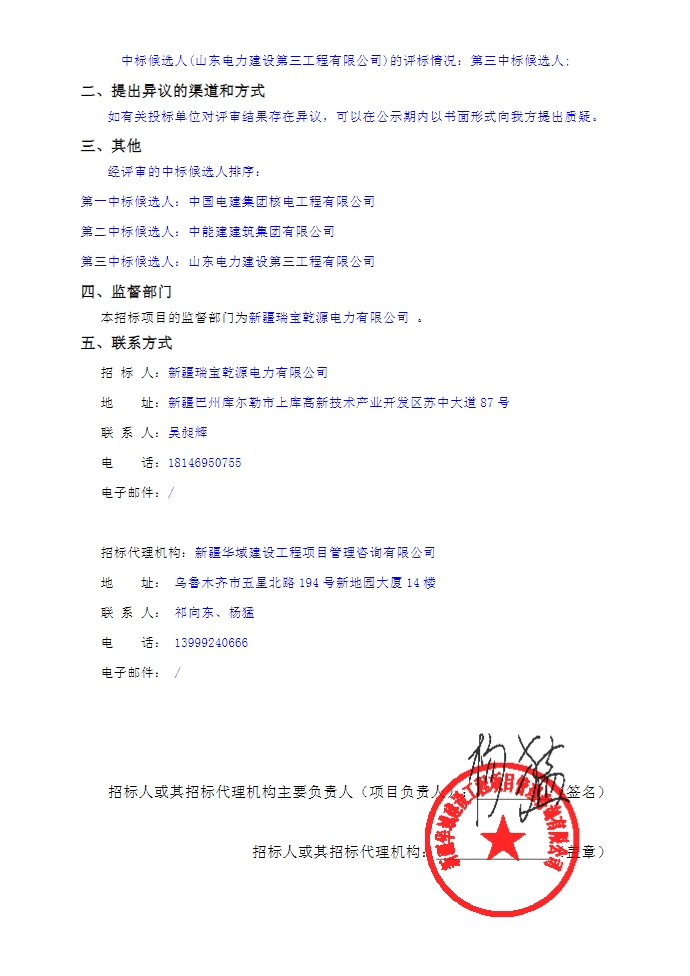 第一中标候选人为中国电建集团核电工程有限公司,投标报价为214400.86万元;第二中标候选人为中能建建筑集团有限公司,投标报价为213500万元;第三中标候选人为山东电力建设第三工程有限公司,投标报价为215400.5万元。