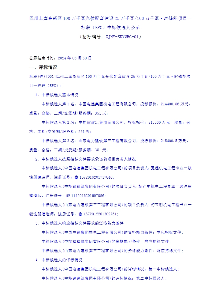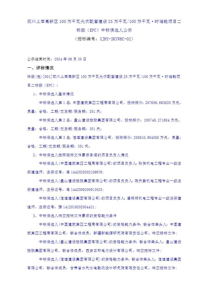 据电力家了解到,6月27日,巴州上库高新区100万千瓦光伏配套建设25万千瓦/100万千瓦·时储能项目EPC中标候选人公示。