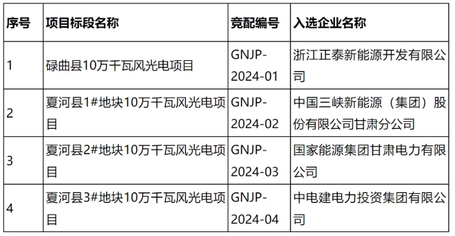 根据公示,4家企业获选甘南州第三批新能源项目竞争性配置项目,分别是正泰新能源、三峡能源、国家能源集团、中电建,各获得100MW新能源项目指标。