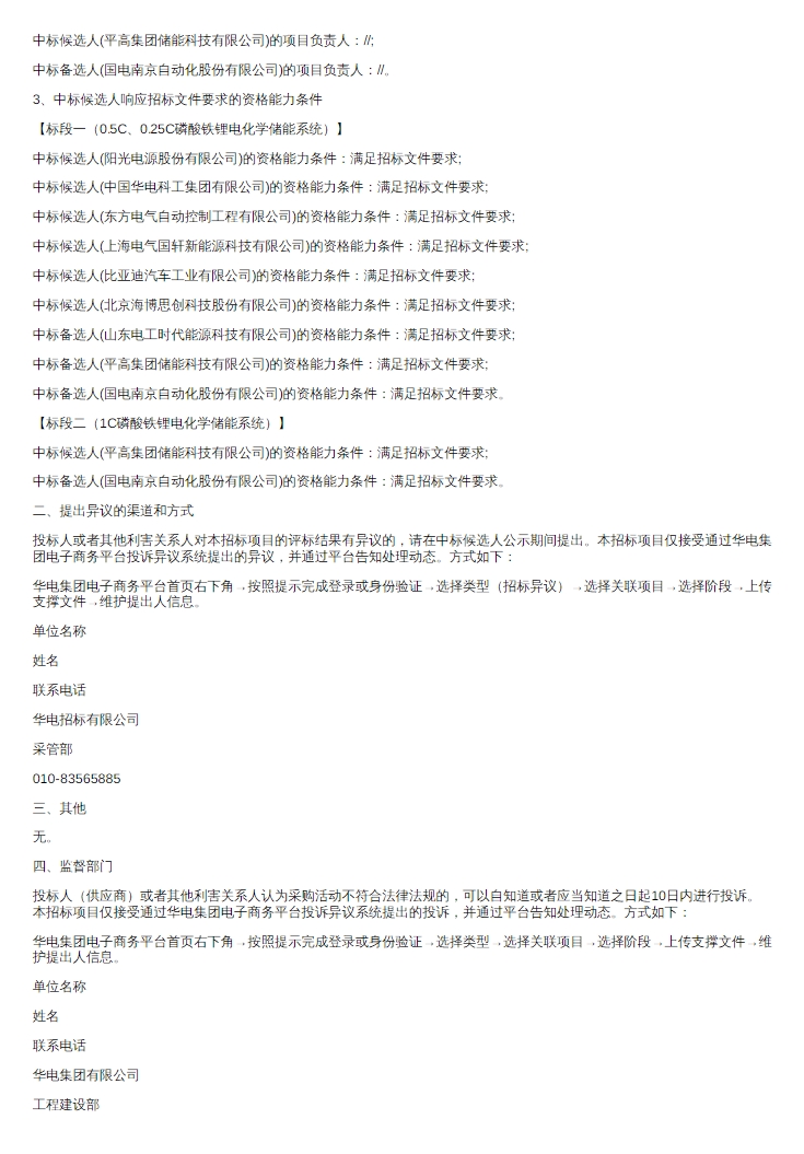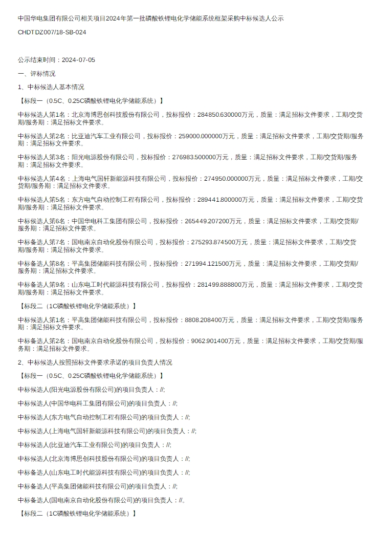 据电力家了解到,7月2日,中国华电集团有限公司2024年第一批磷酸铁锂电化学储能系统框架采购中标候选人公示。分为两个标段,共5.1GWh。