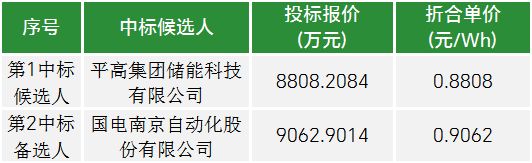 中标候选人第一名:平高集团储能科技有限公司,投标报价:8808.208400万元,折合单价0.881元/Wh。