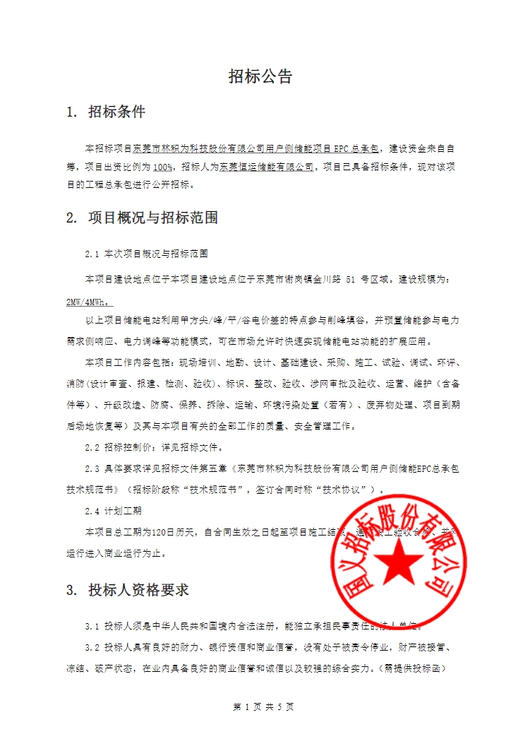 据电力家了解到,7月1日东莞市林积为科技股份有限公司用户侧储能项目EPC总承包招标公告发布。招标人为东莞恒运储能有限公司,建设规模为:2MW/4MWh。