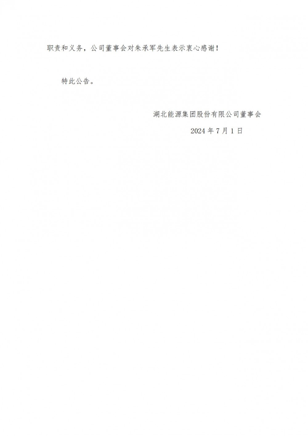 公告表示,湖北能源集团股份有限公司(以下简称公司)董事会于2024年7月1日收到公司董事长朱承军先生的书面辞职报告,朱承军先生因工作原因申请辞去公司董事长、董事及董事会相关专门委员会职务。辞职后,朱承军先生将不再担任公司及控股子公司任何职务。