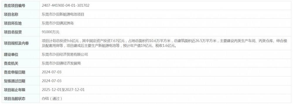 据电力家了解到,近日,东莞市沙田新能源电池项目获得备案。项目位于东莞市沙田镇泥洲岛,总投资9.6亿元。