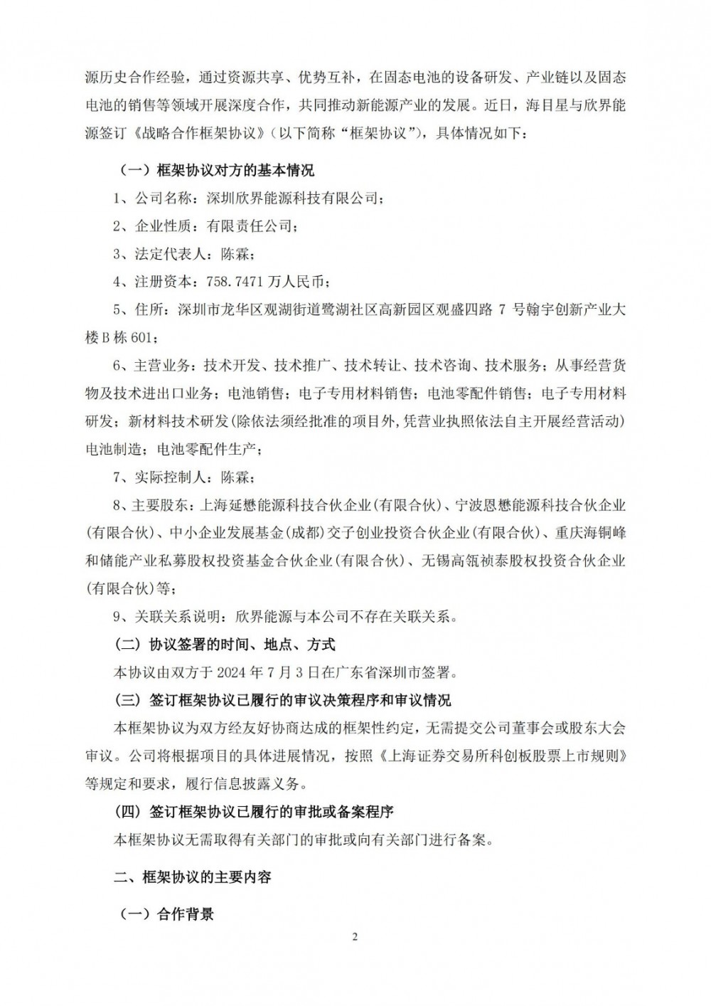 海目星表示,本协议的签订是基于双方对新能源行业发展的共同认知,为开展在固态电池的设备研发、产业链以及固态电池的销售等领域的深度合作,寻求在新能源领域的更大的突破与发展,为实现下一代低空经济飞行器、消费电子、EV、储能等万亿级市场的技术突破,而进行强强联合和资源共享。本次合作符合公司在新能源领域的战略规划,为提高公司的研发创新能力,扩大未来业务空间奠定坚实基础。