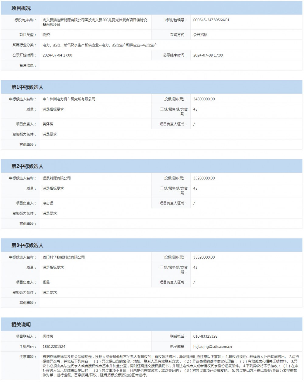 第一中标候选人为中车株洲电力机车研究所有限公司,投标报价34800000元,折合单价0.58元/Wh;第二中标候选人为远景能源有限公司,投标报价35280000元,折合单价0.588元/Wh;第三中标候选人为厦门科华数能科技有限公司,投标报价35520000元,折合单价0.592元/Wh。