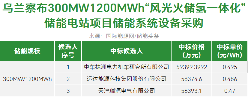 第一中标候选人为中车株洲电力机车研究所有限公司,投标报价59399.3992万元,折合单价0.495元/Wh;第二中标候选人为运达能源科技集团股份有限公司,投标报价58374.6万元,折合单价0.486元/Wh;第三中标候选人为天津瑞源电气有限公司,投标报价56393.1万元,折合单价0.47元/Wh。