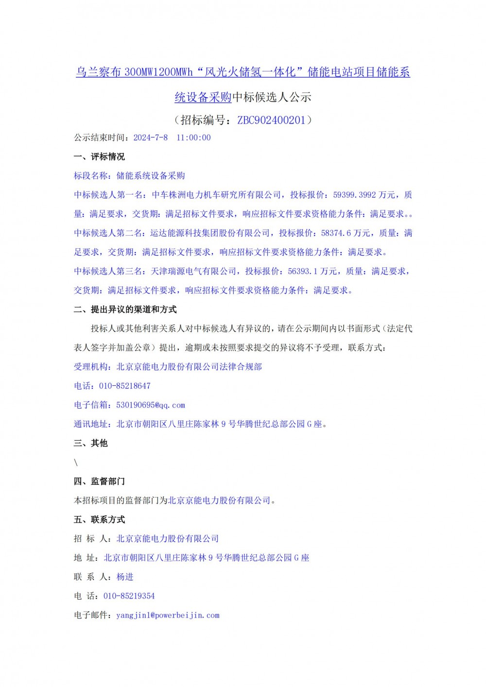 据电力家了解到,7月5日,京能集团内蒙古乌兰察布300MW1200MWh“风光火储氢一体化”储能电站项目储能系统设备采购中标候选人发布。