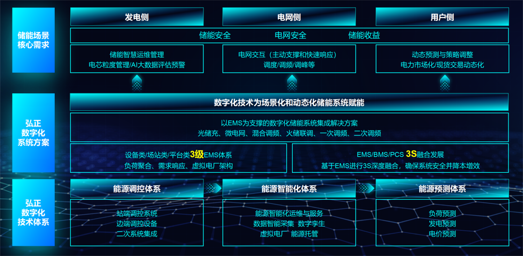 弘正储能自成立以来,就把数字化作为储能解决方案的切入点,形成了能源调控、能源智能化和能源预测三大数字化储能体系,结合自主研发的EMS能量管理系统强大的数据采集、转发及边缘计算能力,能够充分满足虚拟电厂对站点的数据采集、策略控制的各类要求,保障储能设备能够顺畅地接入虚拟电厂平台。