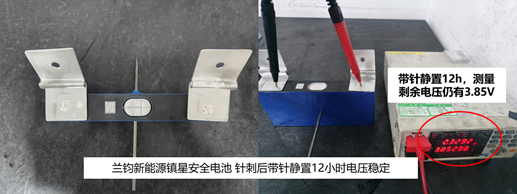 近期,兰钧新能源镇星安全电池顺利通过了针刺测试,实现了针刺不开阀、不起火、不爆炸,测试全程最高温度<50℃,钢针停留在电池内放置12h电压稳定的优异表现。