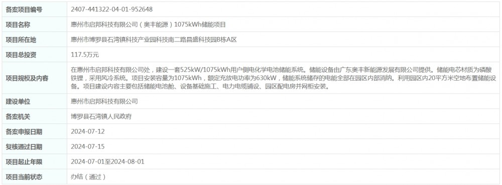 近日,惠州市启邦科技有限公司(奥丰能源)1075kWh储能项目获得备案。项目位于惠州市博罗县石湾镇科技产业园科技南二路昌盛科技园B栋A区,总投资117.5万元。