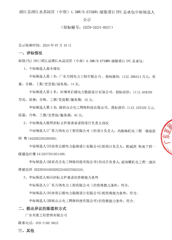 7月15日,浙江浦欣安丰新能源有限公司浦江县浦江水晶园区(中部)4.5MW/9.675MWh储能项目EPC总承包中标候选人公示。