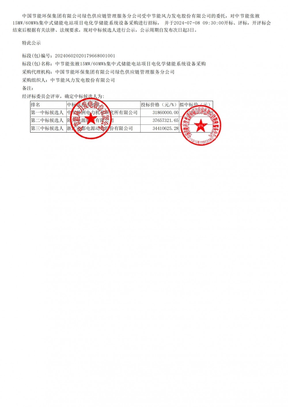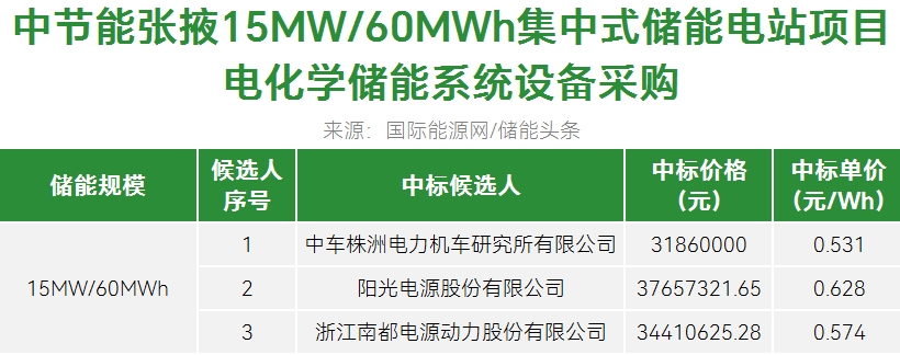 第一中标候选人为中车株洲电力机车研究所有限公司,投标价格为31860000元,投标单价为0.531元/Wh;第二中标候选人为阳光电源股份有限公司,投标价格为37657321.65元,投标单价约为0.628元/Wh;第三中标候选人为浙江南都电源动力股份有限公司,投标价格为34410625.28元,投标单价约为0.574元/Wh。