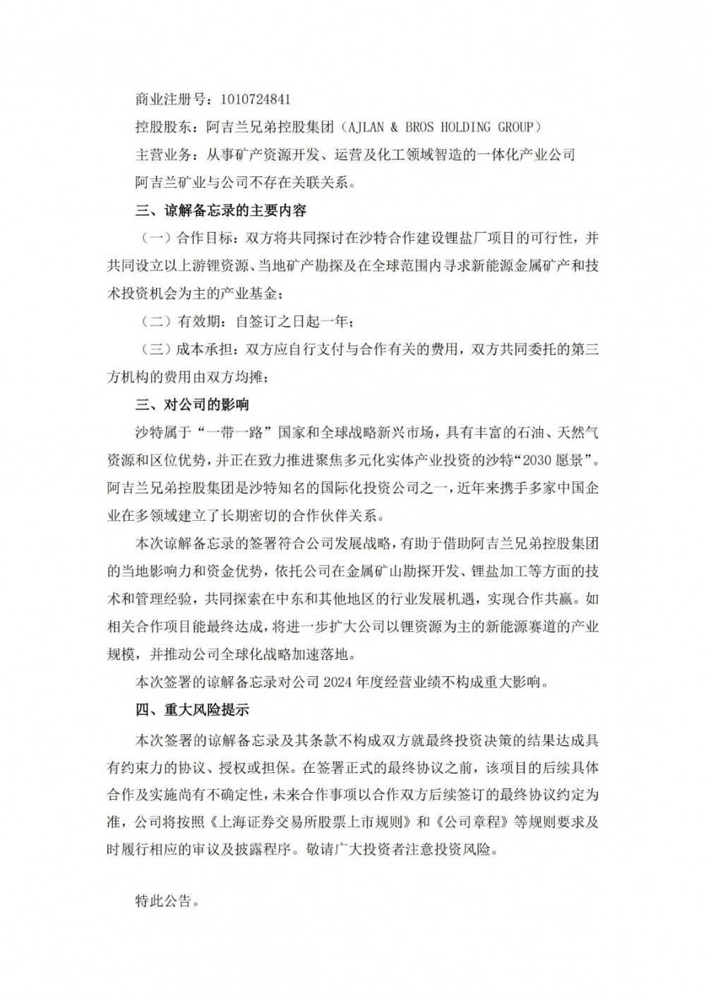 7月16日,海南矿业发布公告称,公司与阿吉兰矿业签署谅解备忘录,就双方拟共同探讨在沙特合作建设锂盐厂项目的可行性,并拟共同设立以上游锂资源、当地矿产勘探及在全球范围内寻求新能源金属矿产和技术投资机会为主的产业基金等合作达成一致意向。