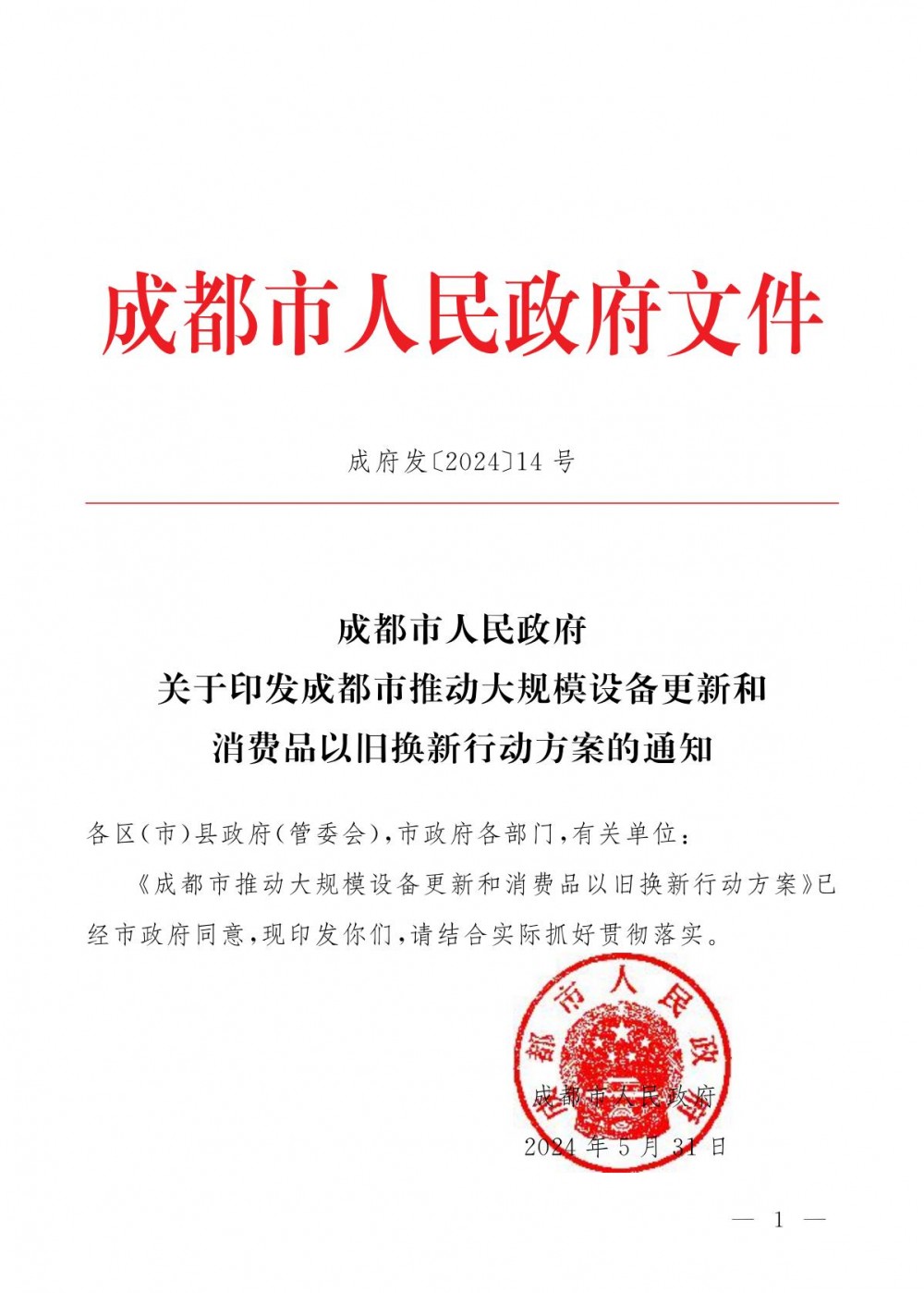 日前,成都市人民政府发布关于印发成都市推动大规模设备更新和消费品以旧换新行动方案的通知。