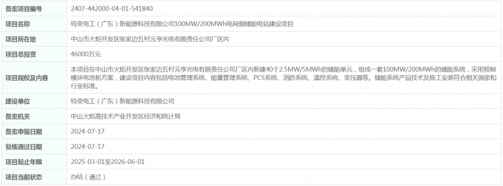 近日,特变电工(广东)新能源科技有限公司100MW/200MWh电网侧储能电站建设项目获得备案。项目位于中山市火炬开发区张家边五村元亨光电有限责任公司厂区内,总投资46000万元。