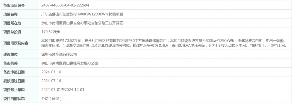 近日,广东省佛山市创意新材600KW/1290KWh储能项目获得备案。项目位于佛山市南海区狮山镇官窑办事处官和公路工业开发区,总投资170.62万元。