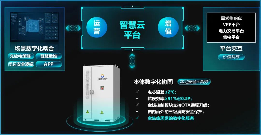 该项目延续了弘正储能系统多维安全和全生命周期价值化设计。弘正智慧储能液冷一体柜实现了从电池PACK到PCS的全链路液冷温控,电芯温差≤2℃,转换效率≥91%@0.5P,在提升散热效率与均匀性的同时,还能显著降低能耗。同时,系统内置的三级消防安全保护机制为项目提供“无死角”安全保障。基于实际应用需求,弘正还通过D-Galaxy智慧储能云平台,为储能电站提供全栈控制模块OTA远程升级,精细化管理和智慧运维等全生命周期数字化管理服务。