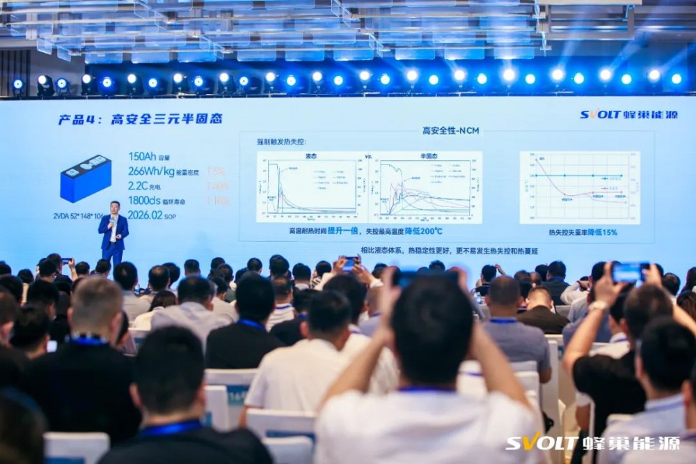 在固态电池的预研上,蜂巢能源在峰会上也发布了能量密度266Wh/kg的三元半固态电池产品,这是蜂巢能源综合可量产搭载时间、成本和应用场景定义的首款产品,主要用于异形包大电量车型。相比液态高镍电池,该款产品强制触发热失控时的耐热时间增加了一倍,失控后最高温度降低200度,热稳定性更好,更不容易扩散到相邻电芯。