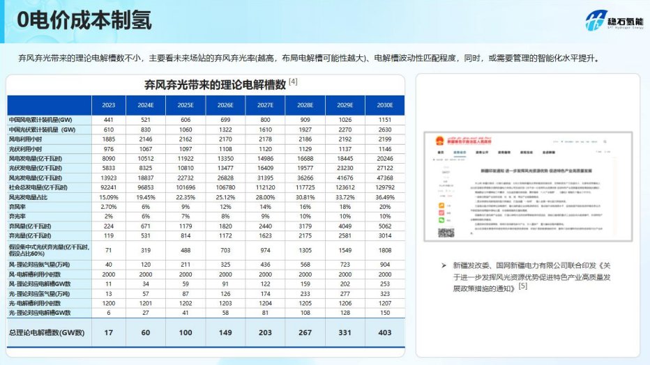 针对低电价成本制绿氢,他预见随着风光经济性的凸显,未来弃风弃光现象或将得到更灵活处理。尤其在三北等地区弃风弃光率现象日益增多,如果能够有效利用这些被弃置的风光资源,通过理论上的大规模电解槽运作,加之风光设备成本的持续下降,将显著降低制氢成本,趋近于零电价成本制氢的愿景。