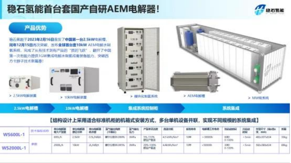 基于对高强度阴离子膜的研究积累,对非贵金催化剂性能不断的突破,于2023年推出首款2.5kW电解槽系统,同年推出10kW电解槽系统。基于对可控弹性支撑层、热固化催化剂和密封的突破,2024年二季度中完成单槽250kW测试验证。