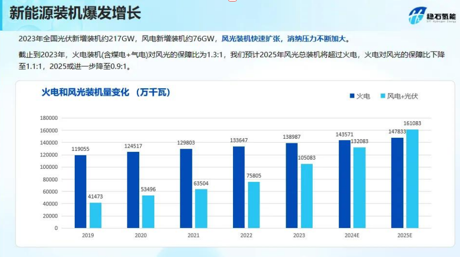 2023年,我国光伏和风电的新增装机分别达到约217GW和76GW,相比2022年新增29278万kW,这一快速增长不仅加剧了电力消纳的压力,也为绿氢产业提供了庞大的市场潜力。王一霖分析,绿氢作为清洁能源载体,可以通过电解水的方式,利用光伏和风电等可再生能源产生的电力进行生产,从而实现能源的有效储存和调峰。因此,风光装机的快速扩张为绿氢产业的发展提供了巨大的市场需求和潜力。