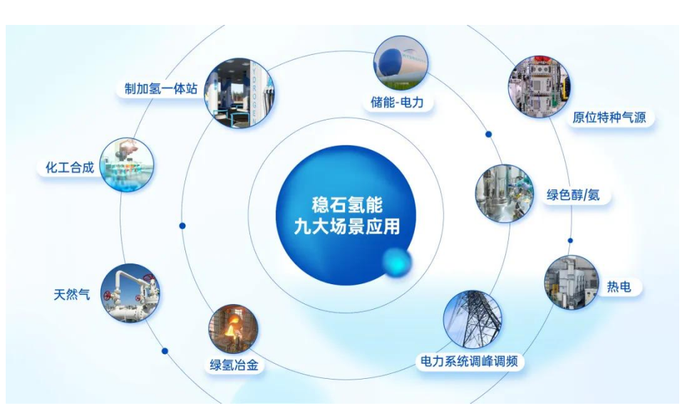 稳石氢能的核心应用场景包括,制加氢一体站、储能电力、原味特种气体、绿色醇/氨、天然气(掺氢)、化工合成、绿氢冶金、电力系统调峰调频、发电机组冷却/纯氢燃烧发电(热点)、固废垃圾制氢等,广泛覆盖能源、交通、化工、冶金等多个领域。