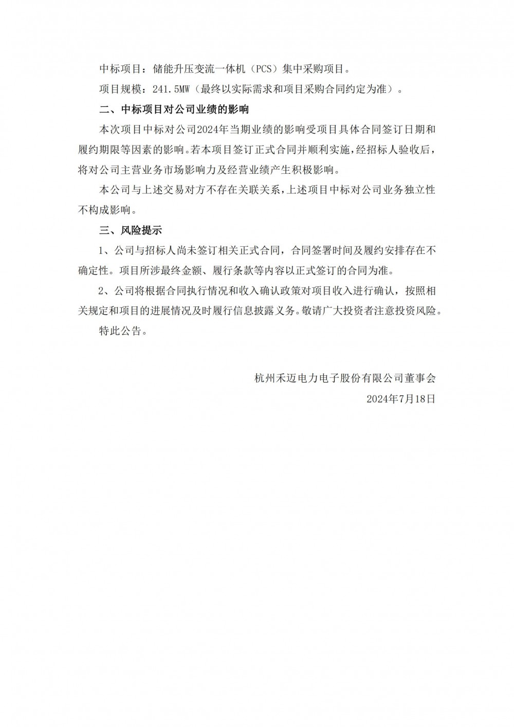 7月18日,禾迈股份发布自愿披露关于项目中标的公告。