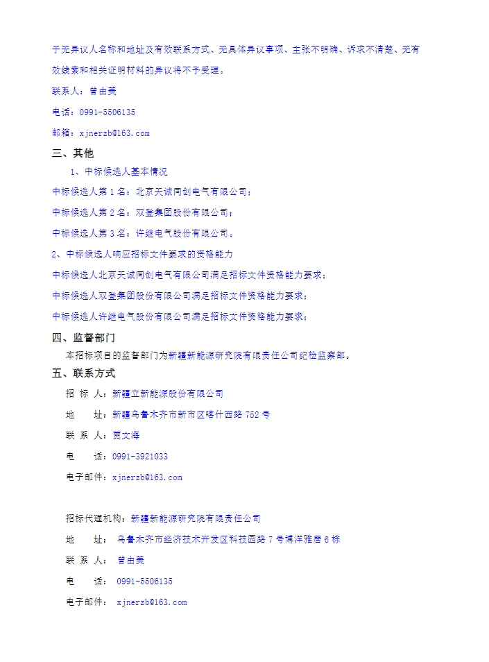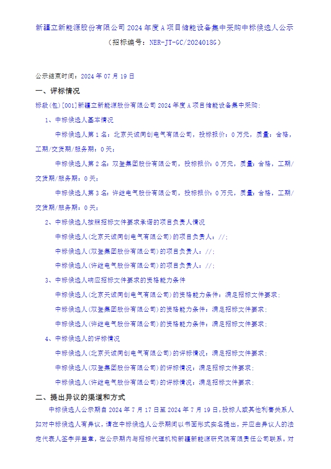7月17日,新疆立新能源股份有限公司2024年度A项目储能设备集中采购中标候选人公示,第一、二、三中标候选人分别为北京天诚同创电气有限公司、双登集团股份有限公司、许继电气股份有限公司。