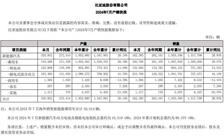 据悉,8月2日,比亚迪公告2024年7月产销快报。