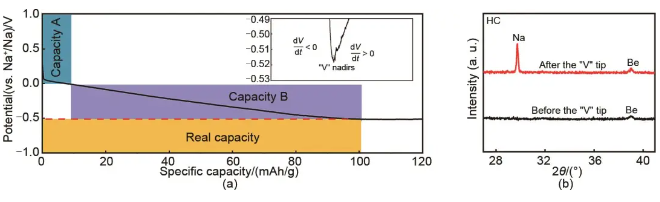 图2 (a)Na||HC半电池在-20 ℃下的放电曲线,插图为V型尖峰;(b) HC放电至尖峰前后的XRD