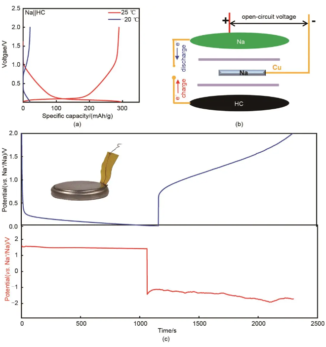 图1 (a) Na||HC半电池在25 ℃和-20 ℃的恒流充放电曲线;(b) 三极电池结构示意图;(c) Na||HC半电池的充放电曲线(上)和钠对电极的电位变化(下),插图为三极电池的实物图