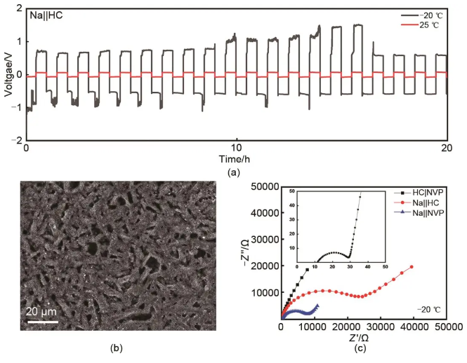 图3 (a) Na||Na对电池在25 ℃和-20 ℃下的循环性能曲线;(b) 钠金属在-20 ℃下循环后的SEM;(c) -20 ℃下NVP||HC,Na||NVP全电池和Na||HC半电池的Nyquist阻抗图谱