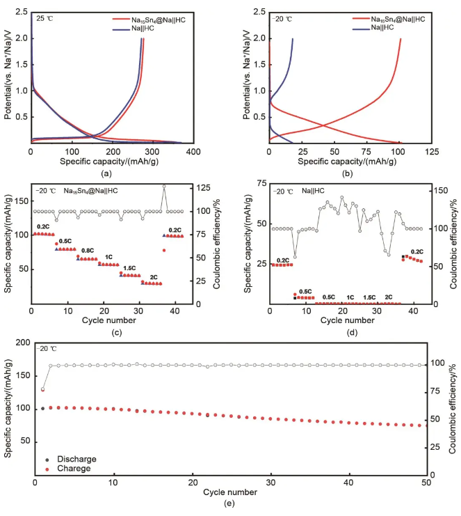 图7 (a) Na15Sn4@Na||HC和Na||HC半电池在25 ℃下的首圈充放电曲线;(b) Na15Sn4@Na||HC和Na||HC半电池在-20 ℃下的充放电曲线;(c) Na15Sn4@Na||HC半电池在-20 ℃的倍率性能;(d) Na||HC半电池在-20 ℃下倍率性能;(e) Na15Sn4@Na||HC半电池在-20 ℃的循环性能