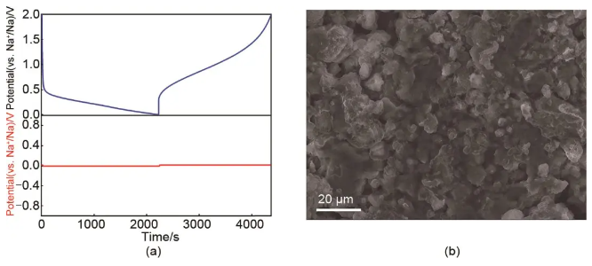 图6 (a) Na15Sn4@Na||HC半电池的充放电曲线(上)和Na15Sn4@Na电极的电位变化(下);(b) Na15Sn4@Na在-20 ℃循环后的SEM