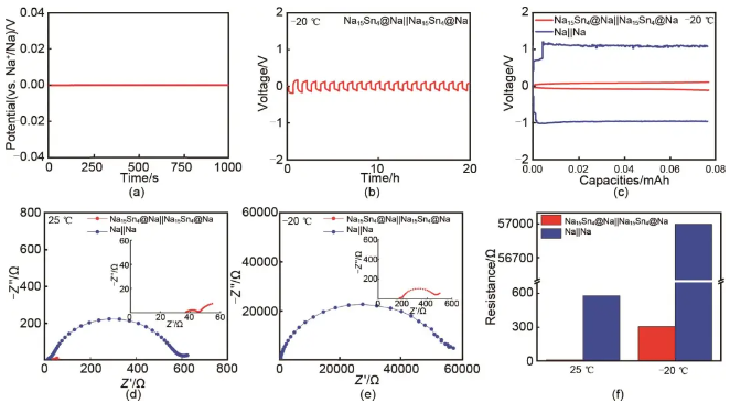 图5 (a) Na15Sn4@Na相对于Na+/Na的开路电位曲线;(b) Na15Sn4@Na||Na15Sn4@Na对电池在-20 ℃低温下的循环性能曲线;(c) Na15Sn4@Na||Na15Sn4@Na和Na||Na对电池在-20 ℃的充放电曲线,Na15Sn4@Na||Na15Sn4@Na和Na||Na对电池在 (d) 25和(e) -20 ℃的Nyquist阻抗谱;(f) Na15Sn4@Na||Na15Sn4@Na和Na||Na对电池在25和-20 ℃阻抗对比图