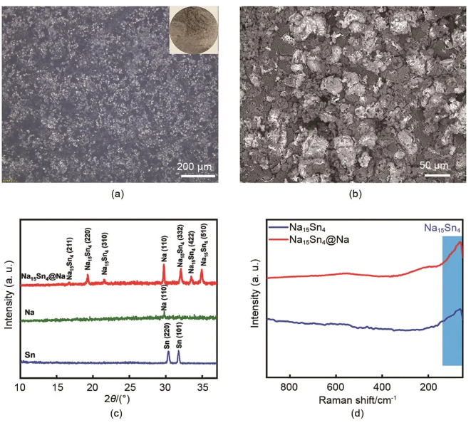 图4 (a) Na15Sn4@Na的显微镜照片和数码照片;(b) Na15Sn4@Na的SEM;(c) Sn、钠金属和Na15Sn4@Na的XRD图谱;(d) Na15Sn4和Na15Sn4@Na的Raman光谱