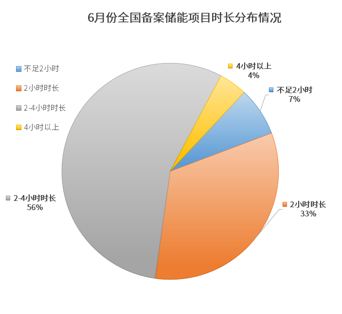 据储能头条不完全统计,从储能时长看,6月份全国备案储能项目中,储能时长不足2小时的项目占全部装机7%,2小时时长的占33%,2—4小时的项目占比56%,4小时以上的项目机占比4%。