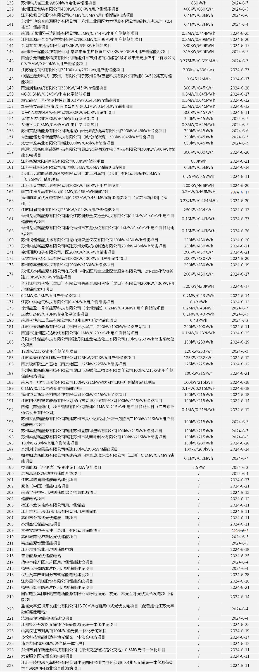 6月江苏省储能备案电站项目有228个,2355.55MW/4937.86MWh,包括共享储能、用户侧储能、光储、源网荷储等多种形式的储能项目,其中以用户侧储能为主
