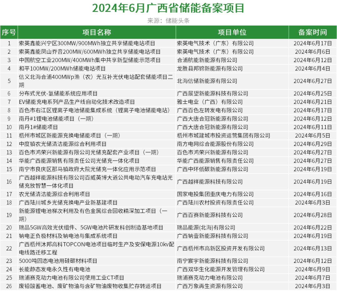 6月广西备案26个储能相关项目,包括储能电站、储能产业链相关产业项目等