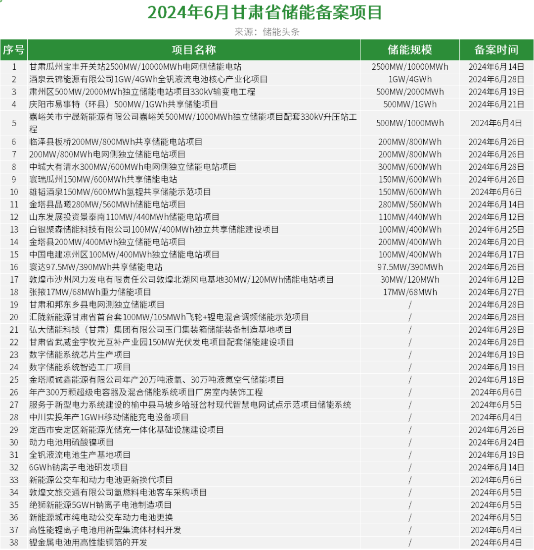 据统计,6月,甘肃备案储能项目38。储能规模6934.5MW/24178MWh。