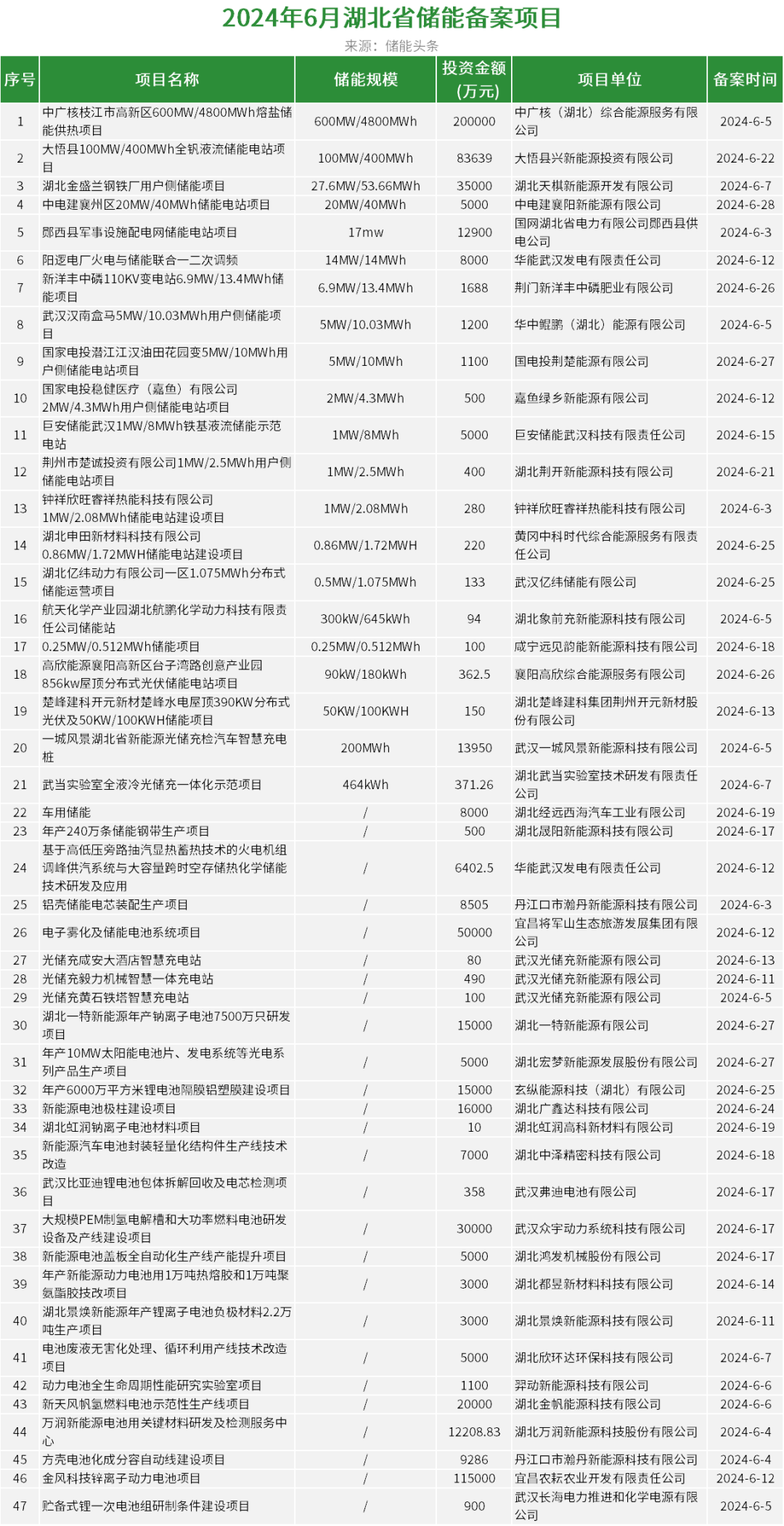 6月湖北省备案储能项目47个,投资金额约70.7亿元,总规模802.55MW/5562.67MWh