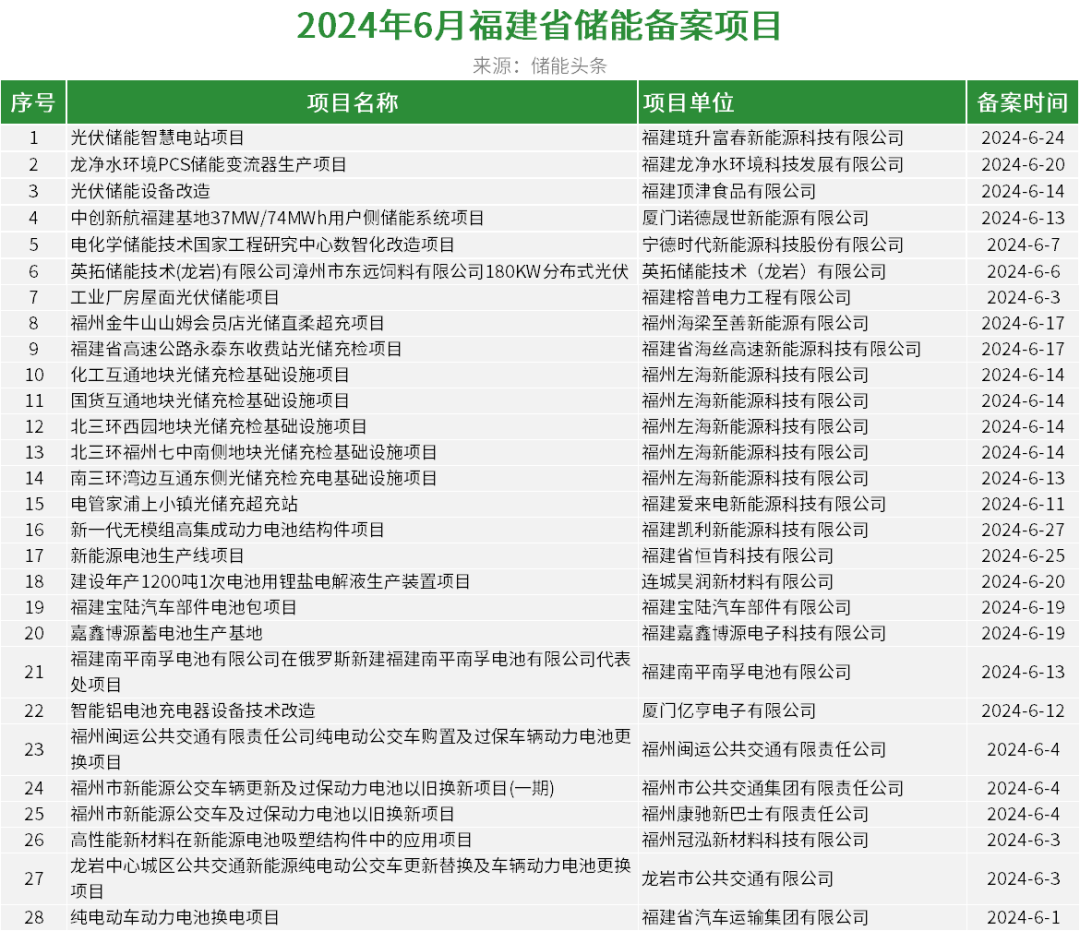 据统计,福建省6月备案储能项目28个,其中多数是以储能产业类型的技改项目为主。